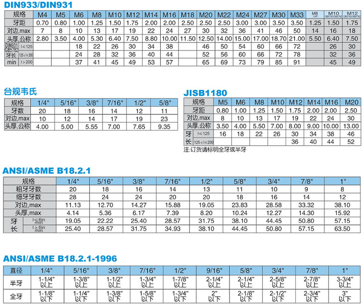 标准:DIN933、DIN931、GB5783、GB5782、14P、ANSI B18 2 1、JISB1180、台规韦氏